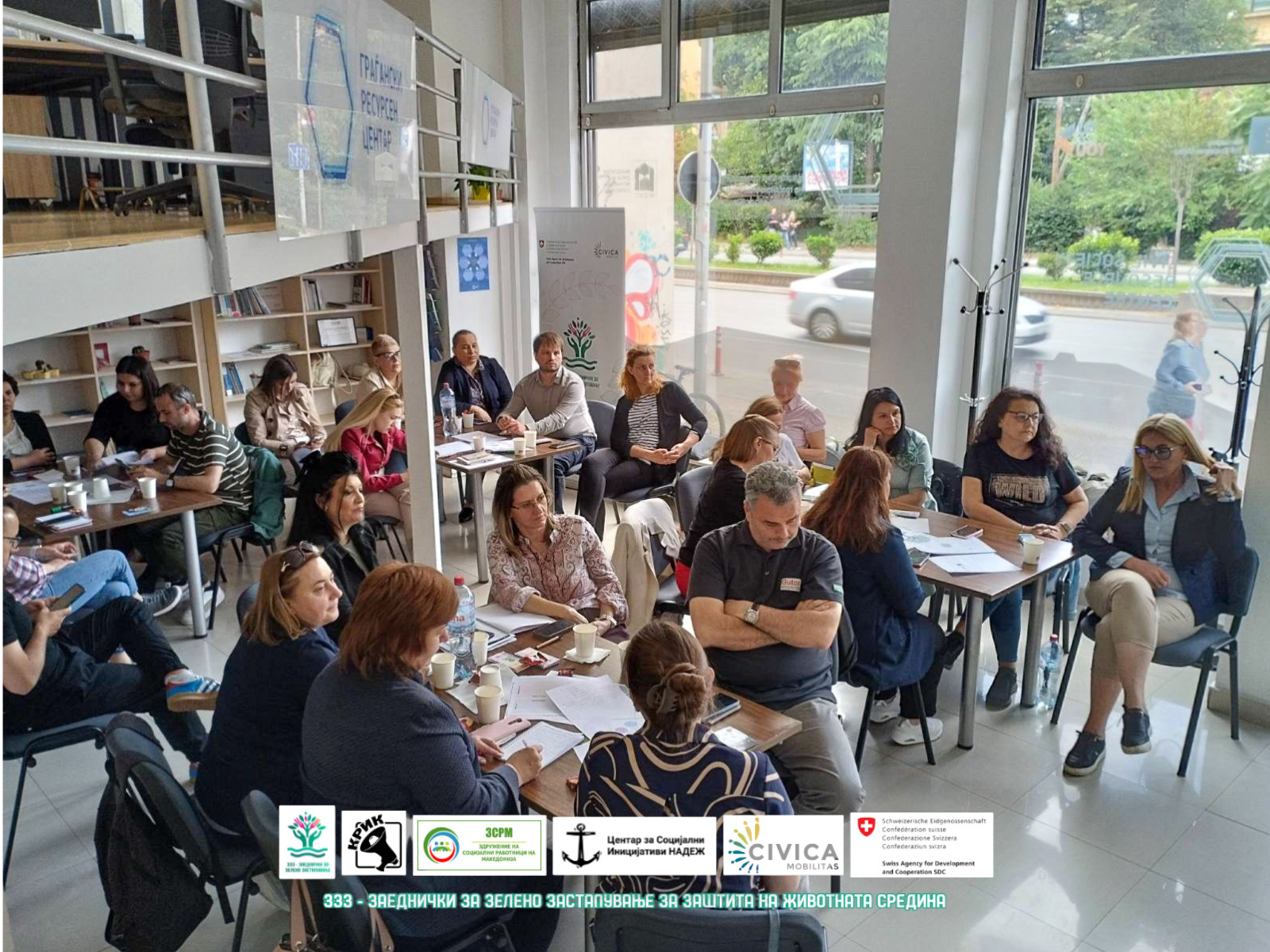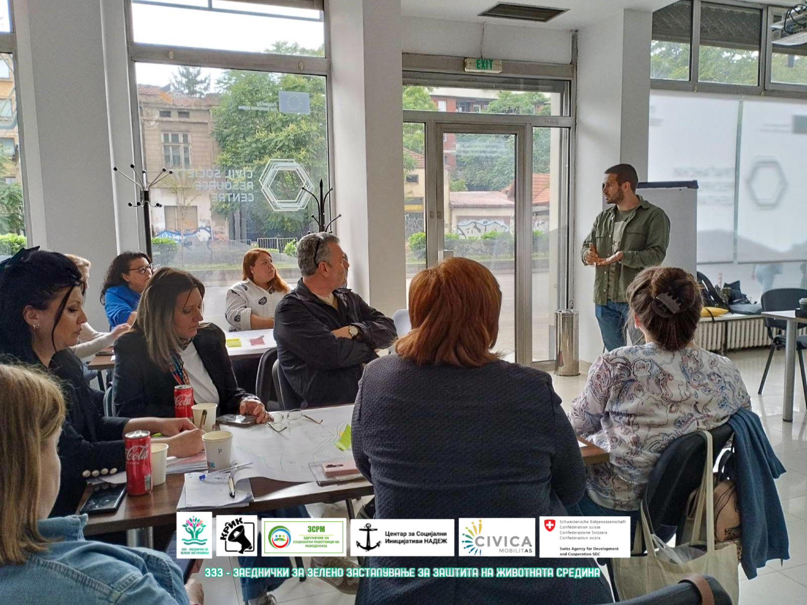 Обуката започна со воведна сесија и креативна интерактивна вежба за запознавање („Прва асоцијација“), која постави отворена и колаборативна атмосфера. Учесниците потоа дискутираа за правните прашања поврзани со животната средина и учествуваа во симулацијата „Бродолом“, преку која ги разгледуваа етичките дилеми, одговорноста и правдата во контекст на социјалната и еколошката заштита. Попладнето беше фокусирано на зелената социјална работа и врската меѓу социјалната заштита и заштитата на животната средина, разгледувајќи добри практики и предизвици.